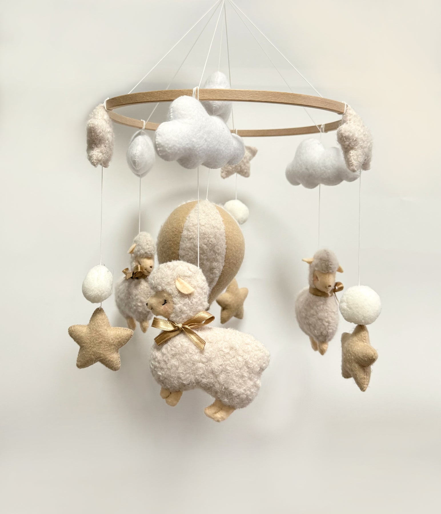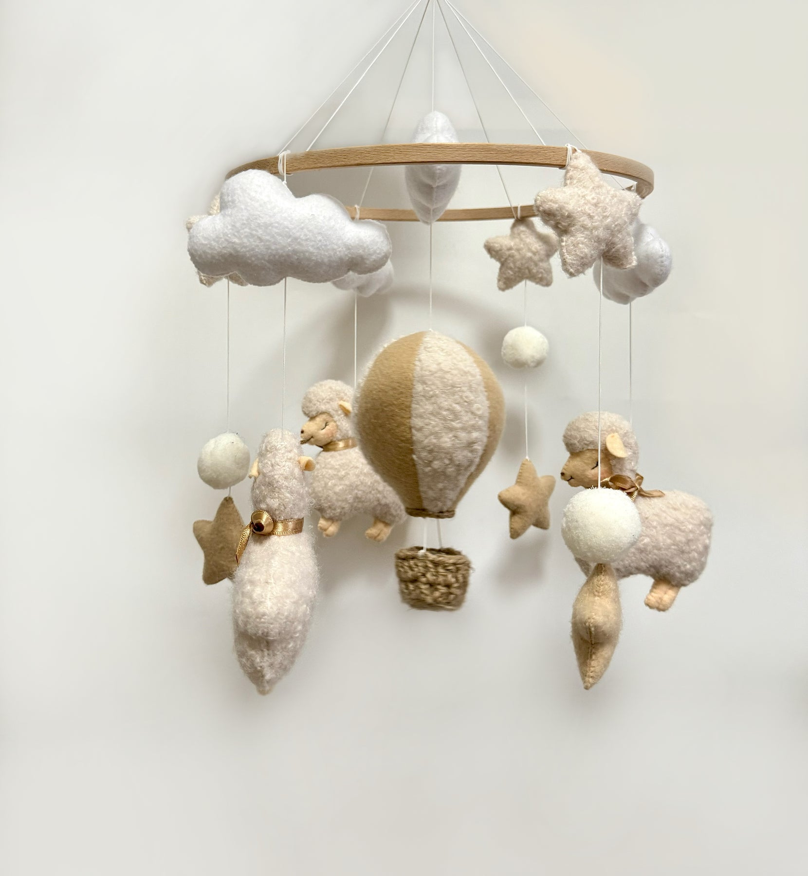 Verleihe dem Babyzimmer eine ruhige, liebevolle Atmosphäre mit unserem handgefertigten Baby-Mobile „Schäfchen & Wolkenzauber“. Dieses zauberhafte Mobile besteht aus flauschigen kleinen Schafen, weichen Wolken, funkelnden Sternen und einem süßen Heißluftballon – liebevoll gefertigt in sanften Naturtönen wie Creme, Beige und Weiß. Die zarten Farben und die weichen Materialien machen es zu einem harmonischen Blickfang über dem Babybett, der Wiege oder dem Wickelplatz.
