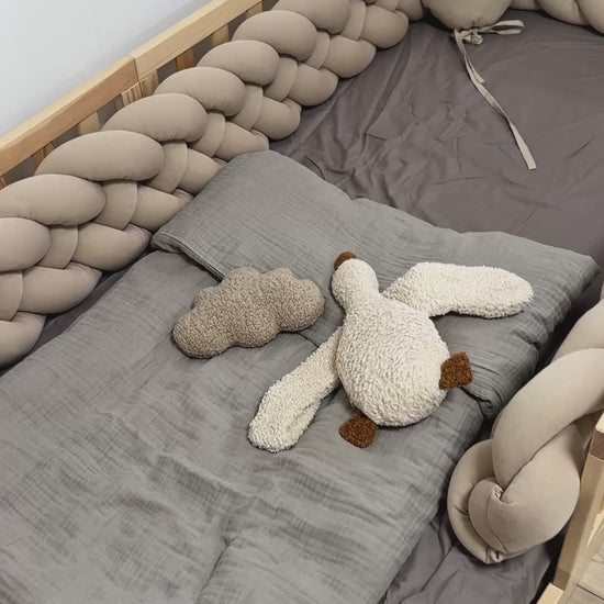 Unsere handgefertigte Bettschlange wurde speziell für Hausbetten entwickelt und schenkt deinem Kind ein Gefühl von Geborgenheit und Sicherheit. Sie legt sich sanft um das Bett – endet exakt am Einstieg – und schützt zuverlässig vor harten Kanten, kalten Wänden und dem Herausrollen im Schlaf.